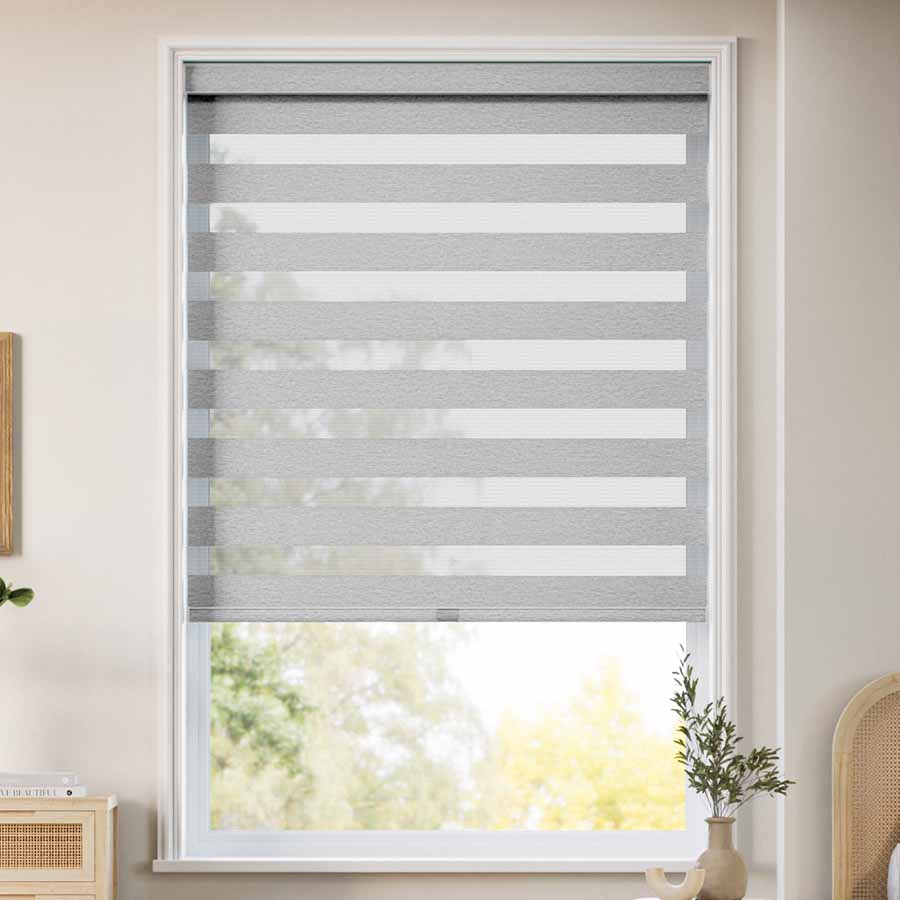 Zebra shades (also called dual-layer or layered shades) feature alternating sheer and solid fabric stripes that glide past one another. This allows you to adjust the amount of light and privacy throughout the day with a simple pull—no bulky cords or complicated mechanisms.